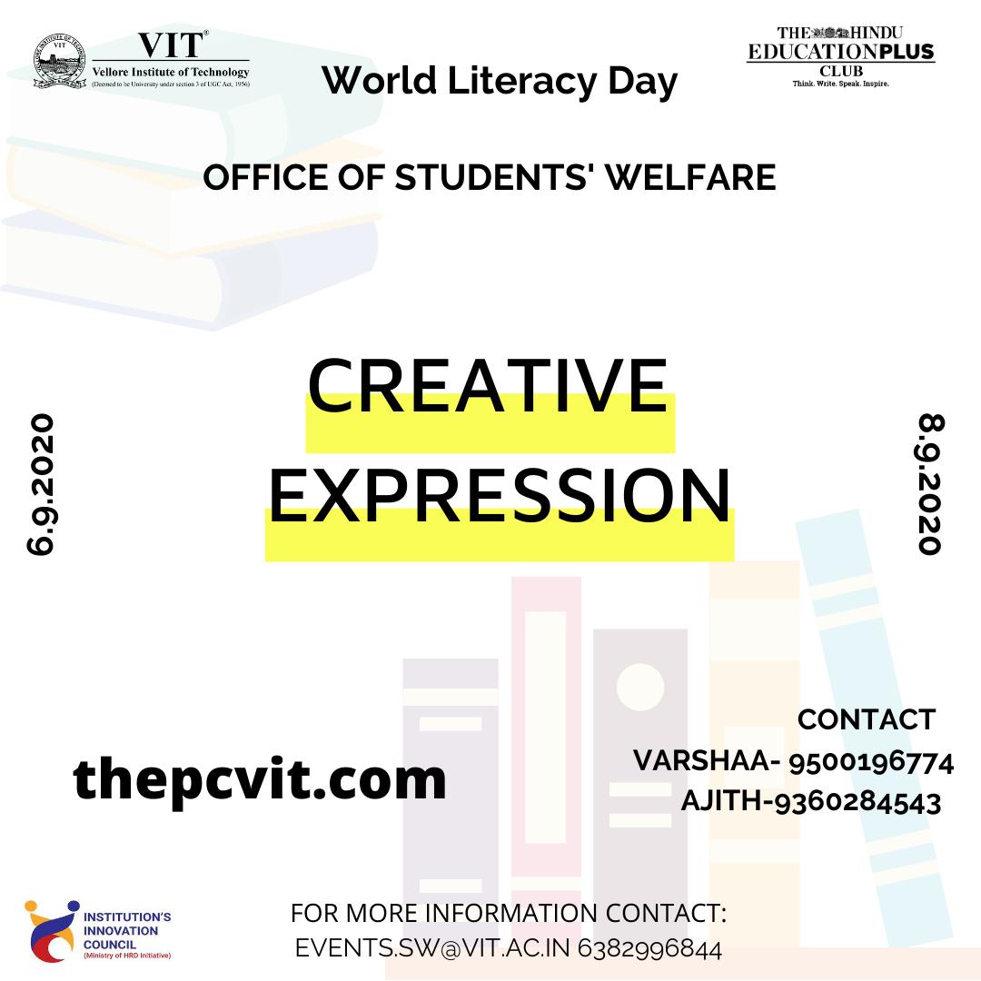Creative Expression is an event that celebrates the World literacy day by encouraging participants to express their love for books/quotes and events from a book/author through any creative medium. The participants can use any medium of your choice - the limit is your imagination.