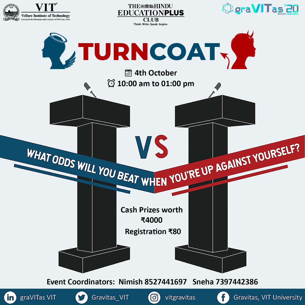 Turncoat is a simple debate style event. The speaker prepares arguments for both for and against the given topic. They must switch their side on a buzzer sound. Best arguments for both sides wins